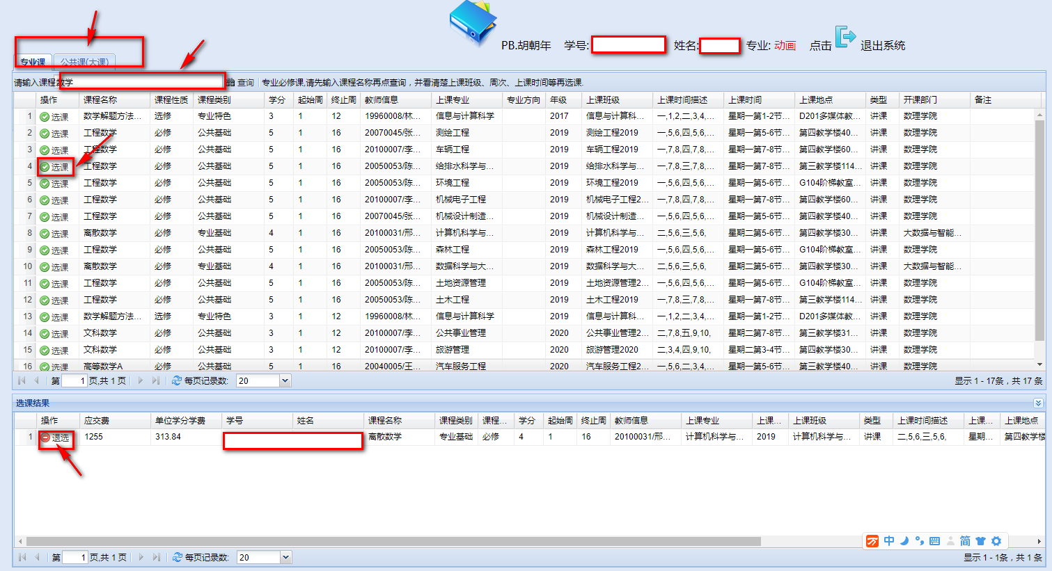 (2)用学号及密码登录后,系统有专业课,公共课(主要是英语、体育、高数等),在相应的地方输入课程名称(可以不输入全称,不要输课程的简称,如“大学计算机基础与计算思维”这门课输入简称“大基”查询不出课程,可以输入“计算机”、“计算思维”、“计算机基础”、“大学”等来查询,不要输入字母及字符)点查询,查询出课程后可根据自己的上课信息找到对应的记录点击“选课”即可选上课程,如果选错课则在选课结果中点击“退课”(已交过费的不能退课)。如果查询出来的课程较多,请进行翻页查找,如下图