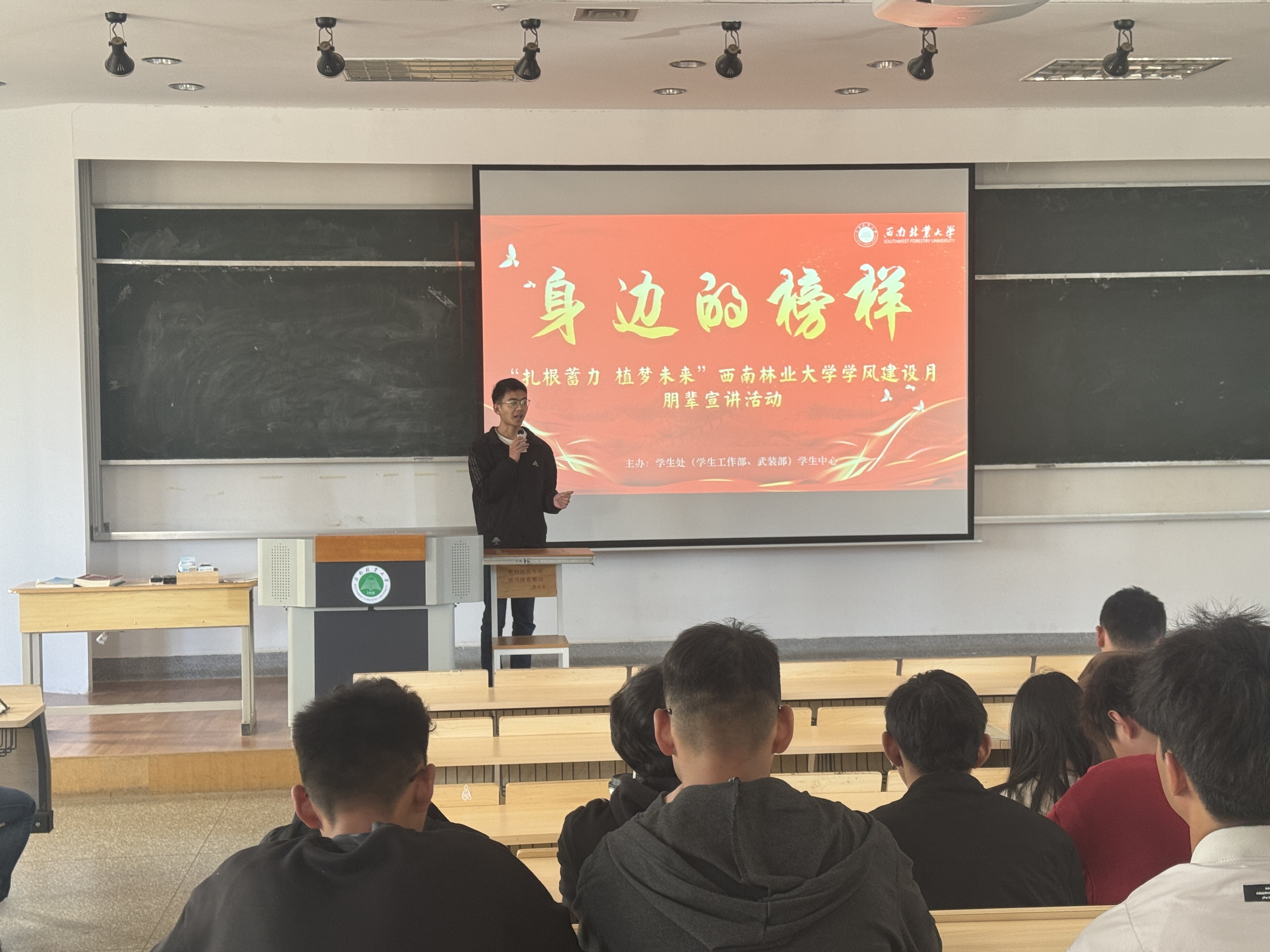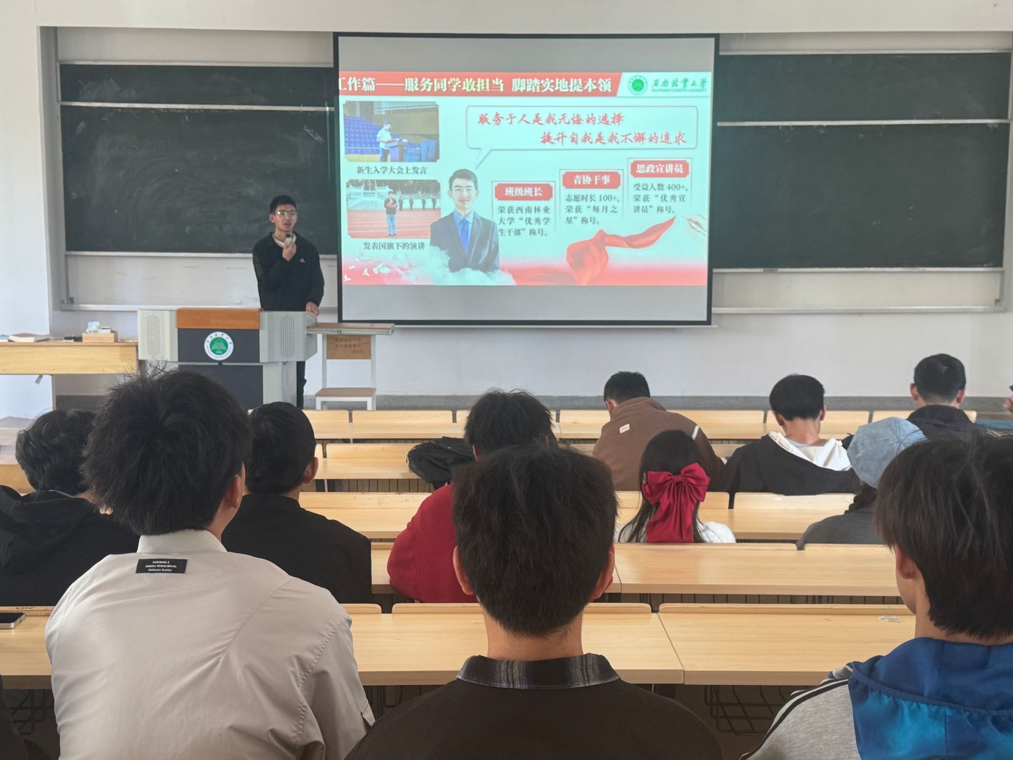 王荣锋同学围绕“行而不辍,未来可期”这一主题,以饱满的热情讲述自己的经历。他分享了西南联大的历史,生动展现师生徒步三千余里的艰辛与伟大,让同学们深刻领悟联大精神的坚韧与爱国内涵,激励大家传承先辈精神,勇立时代潮头。同时,他以杨善洲书记为榜样,诠释善洲精神的忘我奉献与艰苦奋斗,引导同学们以榜样为镜,树立崇高理想,努力成为新时代的有为青年。在个人发展历程分享中,王荣锋同学详细讲述了在竞赛、科研、工作、实践和研学等方面的拼搏故事。