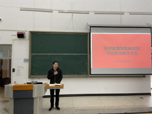 会上,邹再进副院长提出以下几点要求:第一,要严格遵守学校各项规章制度,加强与导师的沟通联系。第二,做好研究生期间的学习和科研规划,清楚每阶段要完成的任务及相关要求。第三,保持青年学生良好的学习朝气,立志成为有为青年。第四,时刻谨记学术诚信和考试诚信。第五,同学之间互帮互助,做“经深勤济,管冗依理”的经管人。